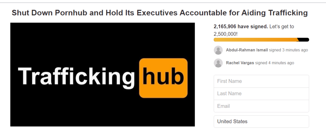 正因为P站行为人神共愤,故而《纽约时报》文章一出,便掀起轩然大波,有216万网民参与关闭Pornhub网站请愿活动。
