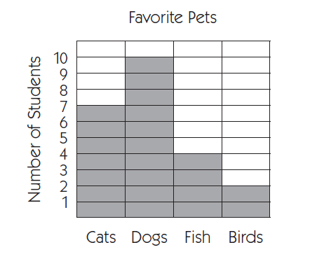 “Sam统计了他们班同学最喜爱的宠物,并绘制了如上的柱形图。习题要求孩子们回答哪一种宠物喜欢的同学最多,有多少同学选择了鱼,选择小狗的比选择小猫的同学多多少等?”