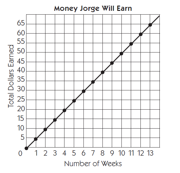 “Jorge想要买一个MP3,因此,他通过每周帮邻居浇花,赚取他的零花钱。习题通过绘制折线图,提供了工作时间与Jorge赚得钱的关系。如果MP3的价格是50美元,那么他需要花多少时间才能赚到足够的钱购买。”