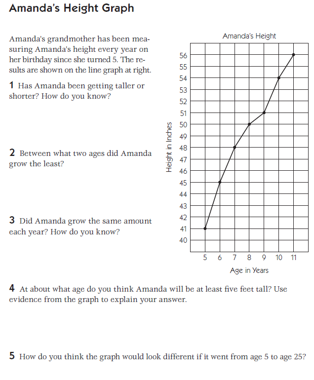 这就是一道和实际生活结合得比较紧密的例题。通过对折线图的分析,孩子们可以很容易找到这道题的正确答案。当然,他们也可以利用除法,求解本题,但对于孩子们来说,图形的结合,能更好地帮助他们理解生活中数学的含义。