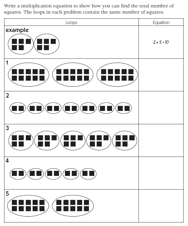 上面这道题,用一个个小正方形代表数量,然后用椭圆圈出相同个数的小正方形代表一组。通过图形的表示,孩子们很容易能够看出每道题是由多少组相同正方形相加和,从而加深对乘法含义的认识。