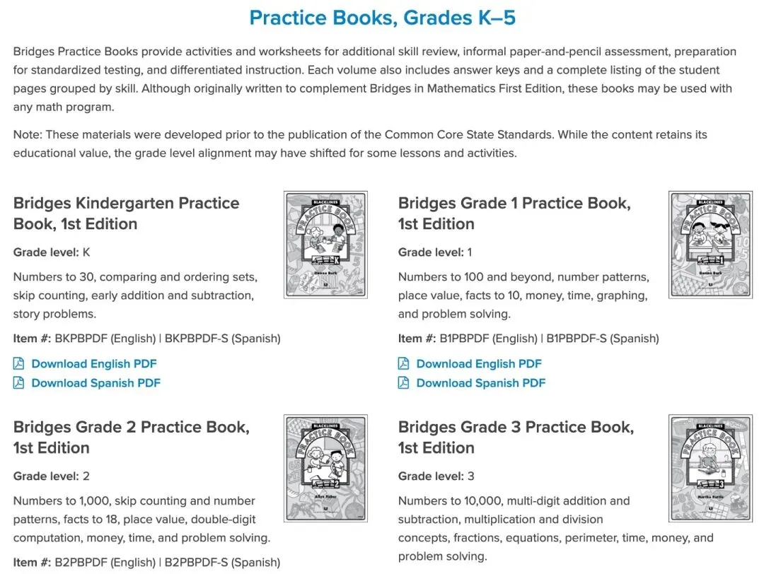 于是我就问了憨憨的老师,她告诉我她给学生用的练习册叫做Bridges Math,是美国Math Learning Center(数学学习中心)编撰的一套数学辅导书籍。因为书籍本身的难度是超过美国现行教学标准的,所以一般都是作为拔尖之用。