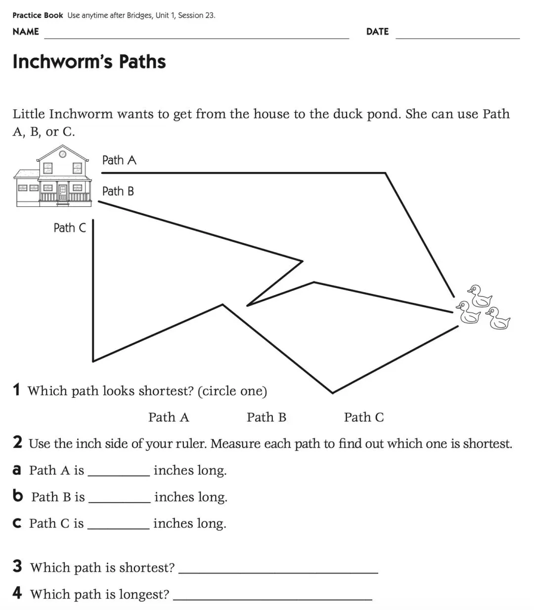 它让孩子仅凭肉眼就去估算三条路线的长短,猜猜哪个最长、哪个又最短。这个就是数学中的估算,它是为了培养孩子对数字的感觉。