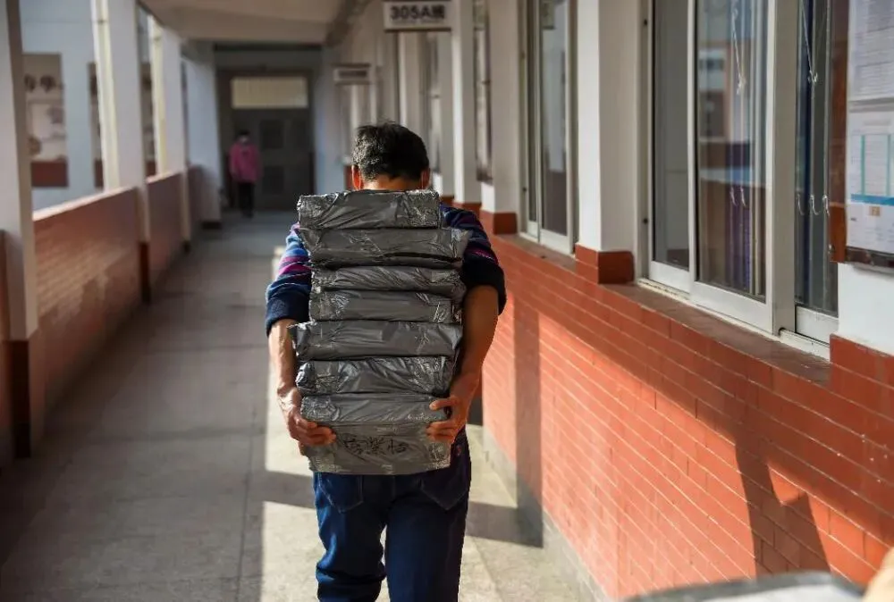 还有一个家长帮忙背书搬运