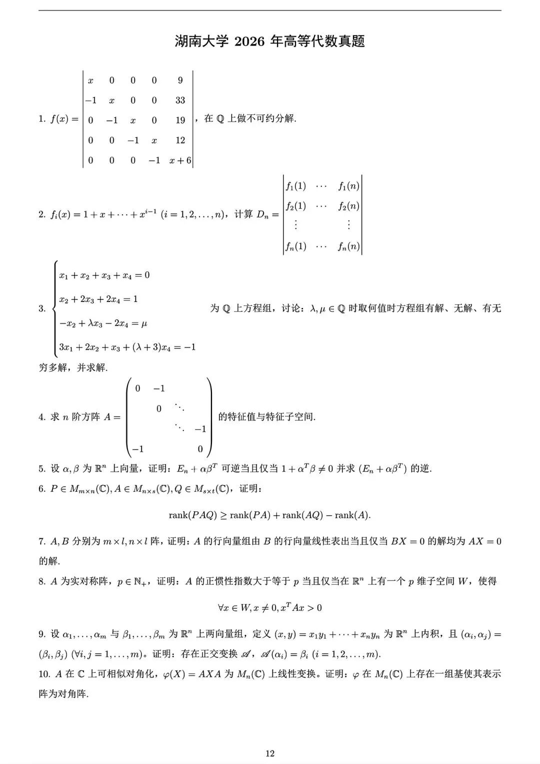>2026年湖南大学高等代数考研真题
