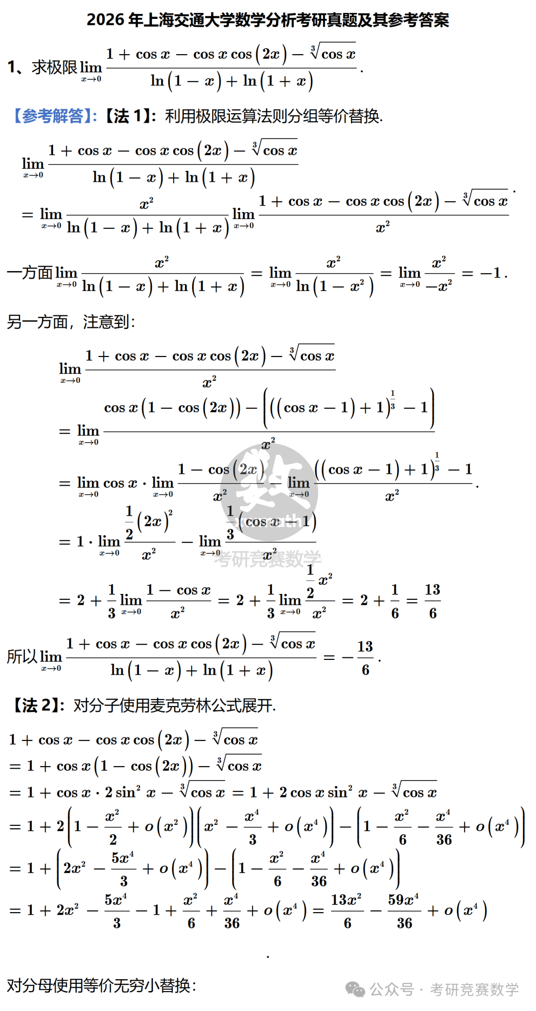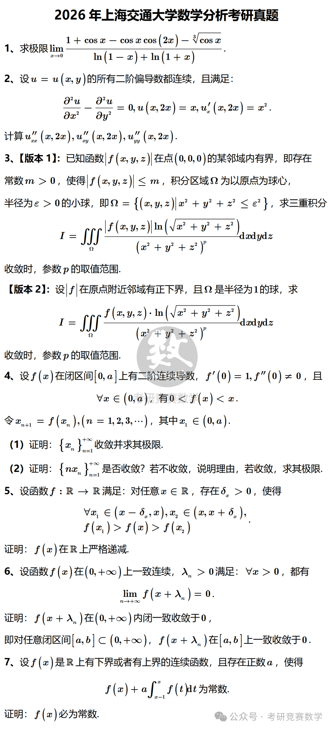 >2026年上海交通大学数学分析考研真题及详细参考解答