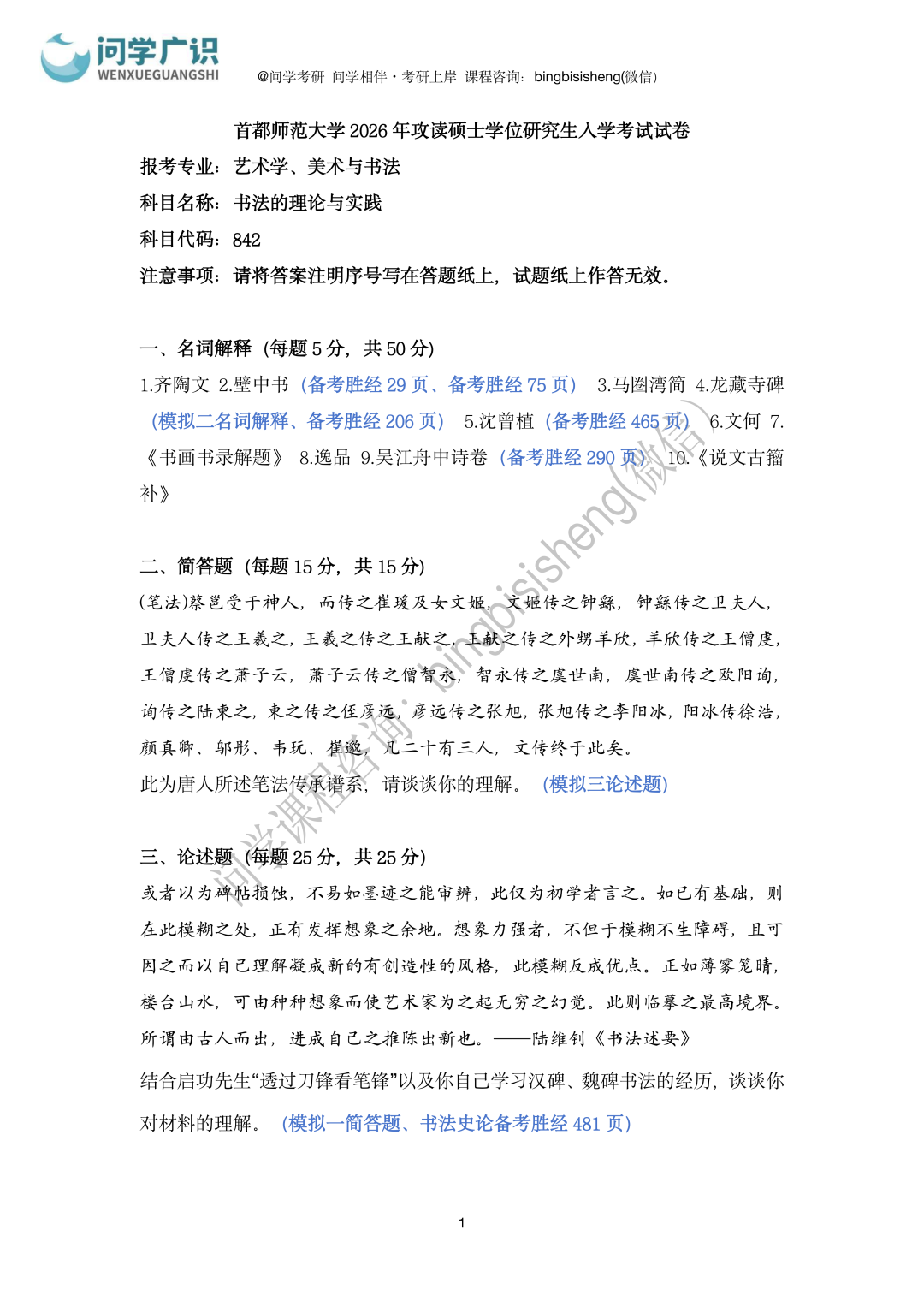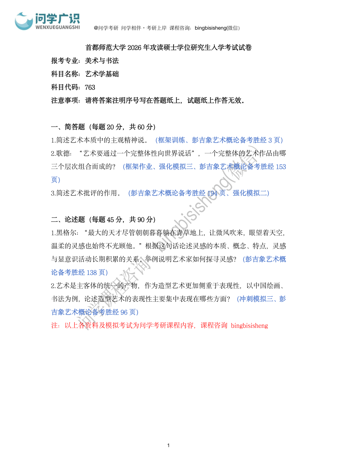 为了帮助更多学子择校备考,问学考研将首都师范大学2026年考研763艺术学基础、842书法的理论与实践回忆真题整理分享