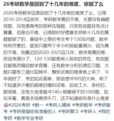 不过也有考生反映,数学题目虽不难,但计算细节要求高,粗心大意容易丢基础分。这也再次印证了考研数学“基础为王”的规律,冷门考点的回归也让备考的“全面性”变得愈发重要。