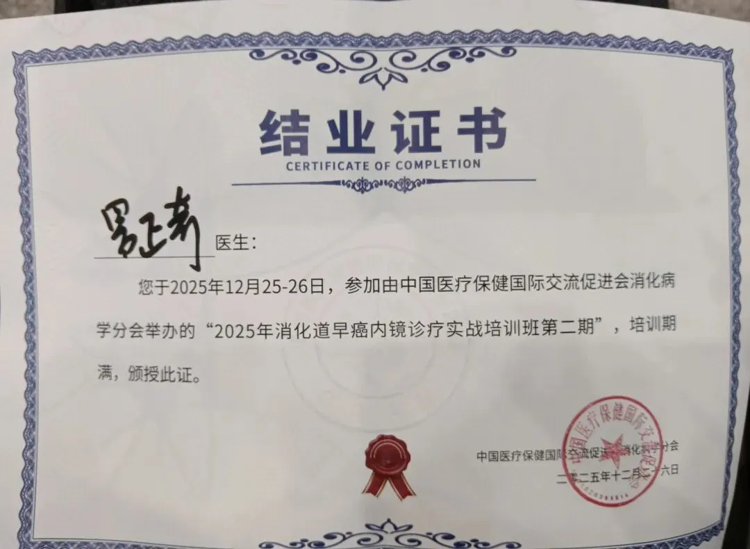 1、早上过来后先看手术直播,中间去做了个离体胃ESD,注射后隆起不理想。直接切边,不太容易,后来增加功率,好不容易切开了,也见到粘膜下层了,在剥离过程中穿孔了,一下子懵了,这还是我第一次亲自遇见。想起以前看别人手术时,比如胃间质瘤还有结肠ESD时见过穿孔,原因是太靠近肌层。这次考虑粘膜下液体垫太少,功率偏高,刀头对着肌层了。看来失败也是一种学习!2、回来后又看了两个ESD,其中一个是回盲瓣部位肿物水下ESD,以后可以尝试。3、午饭后又听了三堂课,未分化癌这一课让我又多了一些感性认识,看来自己还是有很多不明白,知识还不够系统,比如为何腺管为什么融合,白区为何增宽,做不到既知其然又知其所以然。接着是大家分享内镜操作视频,随时暂停提问。我分享了在泰州进修时发现的一个早癌。这个病例马上要陪伴我一年了,我对它的认识还在加深。4、最后又用很快的时间回顾了一些学员的病例,来的都照顾上。老师们的点评很有见地,我分析他们的经验来源于大量的内镜与病理的反复对比与反馈,认识不断深化,这是我后续的学习方向。会后获得了学习证书,做个纪念。5、出来学习还有一个很重要的作用,就是刺激自己思考,听别人讲,看别人是怎么做的,是怎么分析问题的,与人交流,脑筋就动起来了。学然后知不足,自己再慢慢查资料,一点点积累。