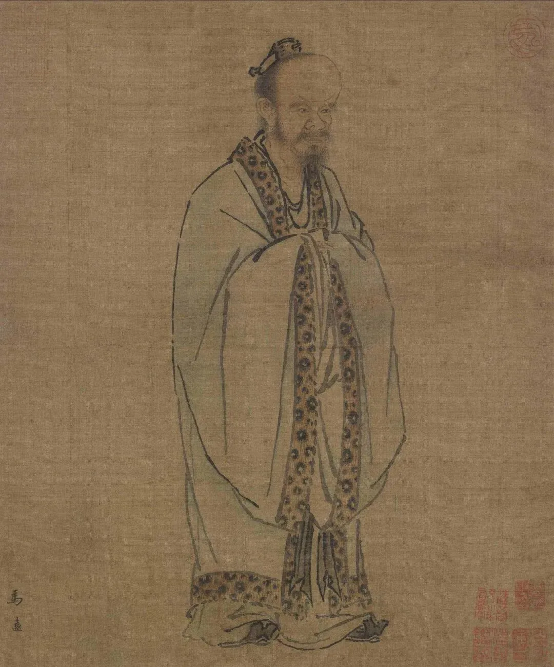 马远的《孔丘像》,目前学界存在两种主要观点:一种是传统上认为它是马远真迹和宋代孔子画像的代表作;另一种则认为它并非马远所绘的孔子像,学者牛国栋认为《孔丘像》很可能是马远《庄子像》的摹本的再摹本,其制作时间应在1920年之后。 但在此处并不影响我们研究其绘法。