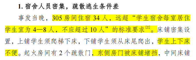 从事故调查报告中的信息来看,每个学生宿舍居住要求不应超过10人,而该宿舍住宿34人,远超要求的标准。如果单从标准来看,当然是严重违规的;但事发之后,我们换个角度,来看看这个标准的合理性呢?