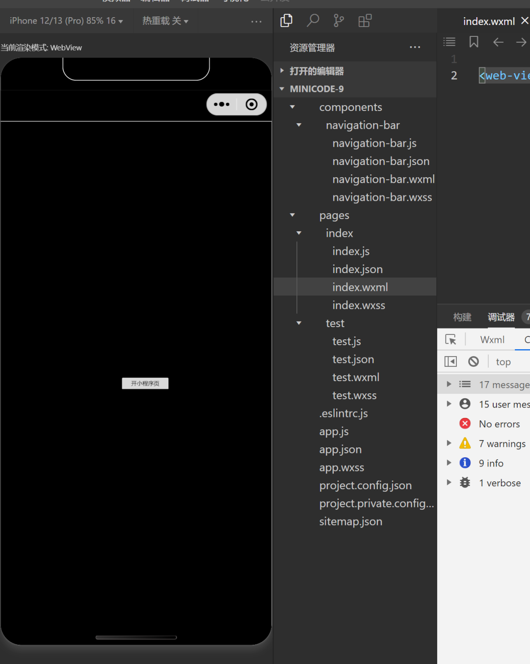 由于每次打包会被删除html文件,可以提前创建一个模板避免每次删除后再添加情况。Cocos 的资料准备完成后。接下来就需要在小程序客户端进行测。准备好自己的小程序。官方提供是测试号。小程序当中,加入web-view的组件,填写cocos的测试地址。代码如下,注意,这个代码只是临时的地址。一般情况下是走https的域名。本地没有证书,就用这样本地测试即可。<web-viewsrc="http://192.168.52.1:7456/web-mobile/web-mobile/index.html"/>