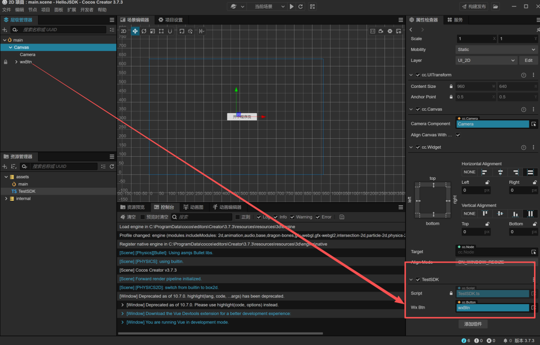 但是在使用的时候需要判定一下window['wx'] 是否存在避免出错。使用jssdk 打开test的页面。编写完,将脚本挂在canvas 下,拖动按钮,完成这个监听流程。 <scripttype="text/javascript"src="https://res.wx.qq.com/open/js/jweixin-1.3.2.js"></script>