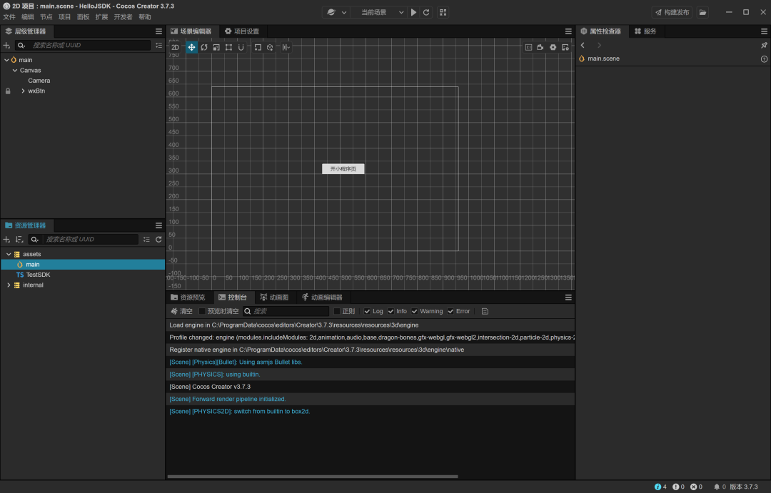 实验过程,我们先建一个cocos 测试用例,用的是2d空模板。这次实验版本用3.73版本。(3.8x也是无问题)在场景创建一个按钮,并在按钮加上一个监听跳转。这个方法从官方文档jssdk提供。代码如下 window['wx'].miniProgram.navigateTo({url: "/pages/test/test"});