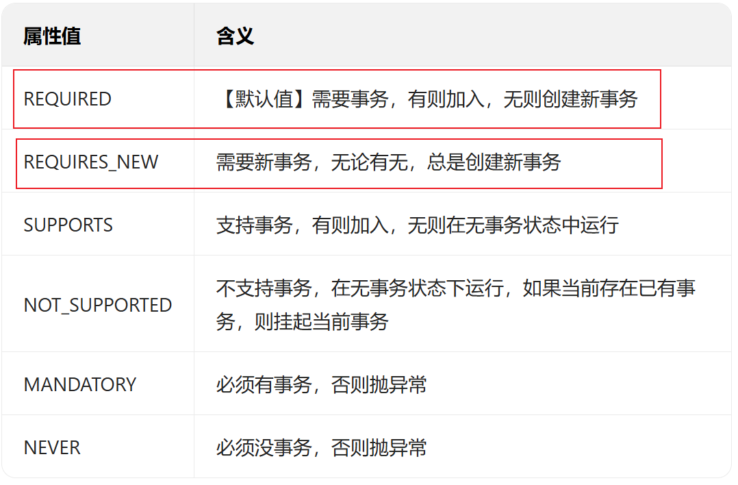 @propagation注解 用来配置事务传播行为(当一个事务方法被另一个事务方法调用时,这个事务方法应如何进行事务控制。)