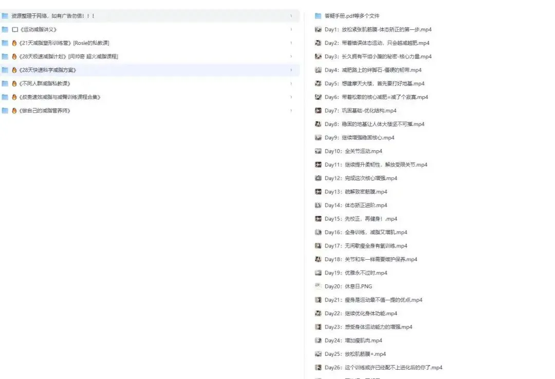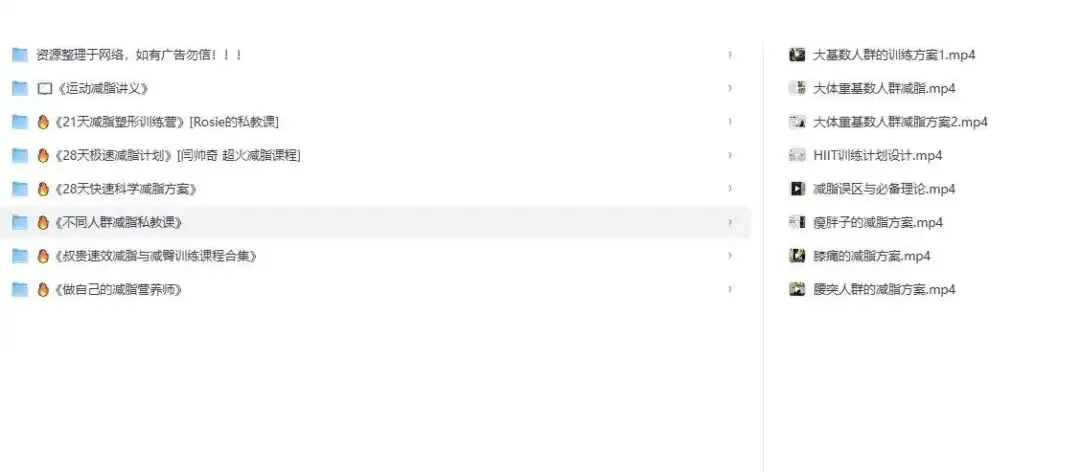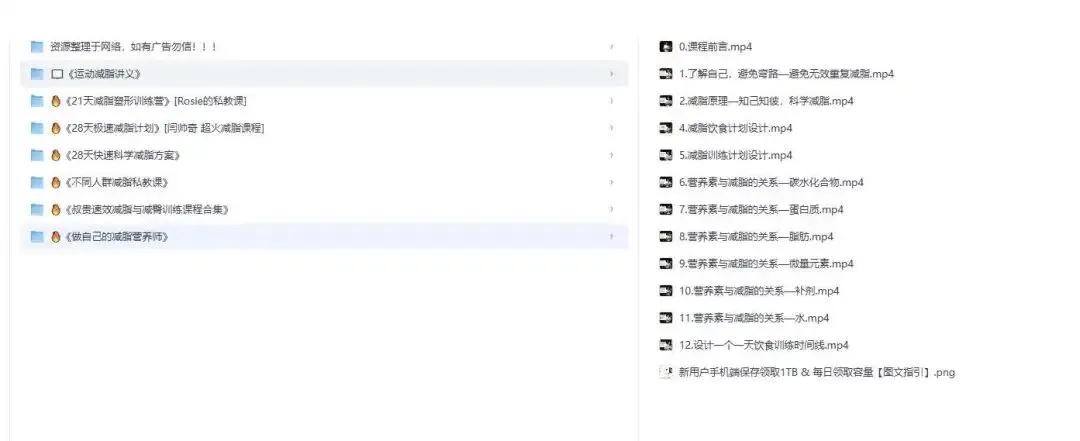 近期我想系统梳理减脂相关的学习内容,之前零散存了不少训练、饮食类的资料,翻找起来很费时间,所以干脆花了点功夫把这些内容整理归档,做成一份个人使用的学习资料备份记录。整理的目的就是让后续自己看的时候能更有条理,不用再零散找内容,这纯粹是我个人的学习备忘,不涉及任何推荐。
