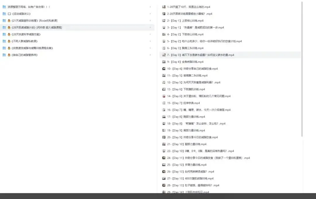 这一部分包含运动减脂的讲义、减脂营养相关的内容,比如减脂原理、各类营养元素和减脂的关系、饮食计划的设计方法。 内容结构偏基础理论和知识普及,内容是成体系的,覆盖了减脂里的理论和营养逻辑。 我会在开始训练前或者需要自己设计饮食方案的时候,用这部分内容补全减脂的基础认知。