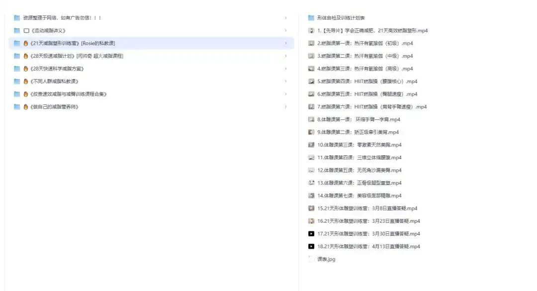 这一部分包含21天相关的训练内容,比如不同难度的燃脂课、各部位的体雕课,还有对应的直播答疑内容。 内容结构上是按训练部位和难度划分的,整体聚焦在短期集中训练上,内容模块比较明确但没覆盖长期周期。 我打算在刚开始尝试规律减脂训练的时候用这部分内容,先通过短期集中训练找到节奏。
