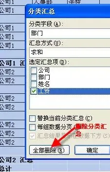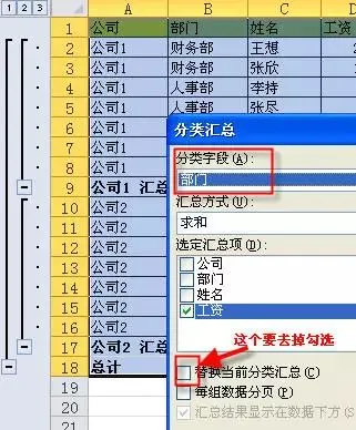 第3步再次打开 数据 - 分类汇总,设置分类字段为“部门”并去掉“替换当前分类汇总”