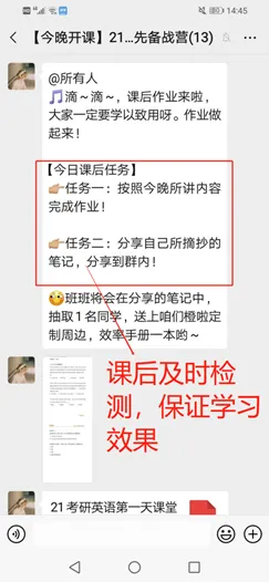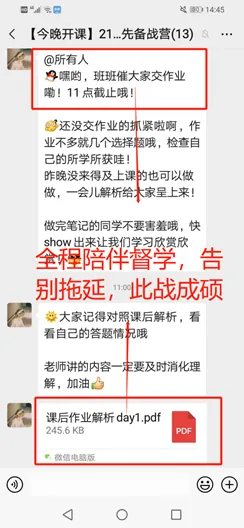社群还有着围绕课程内容的 配套服务 。每次课后,助教老师都会在社群里布置作业,并进行一对一的作业批改和互动答疑。更有专业的辅导老师,实时为你解答——来自学校、专业选择,复习计划安排等多方面的疑题困惑!