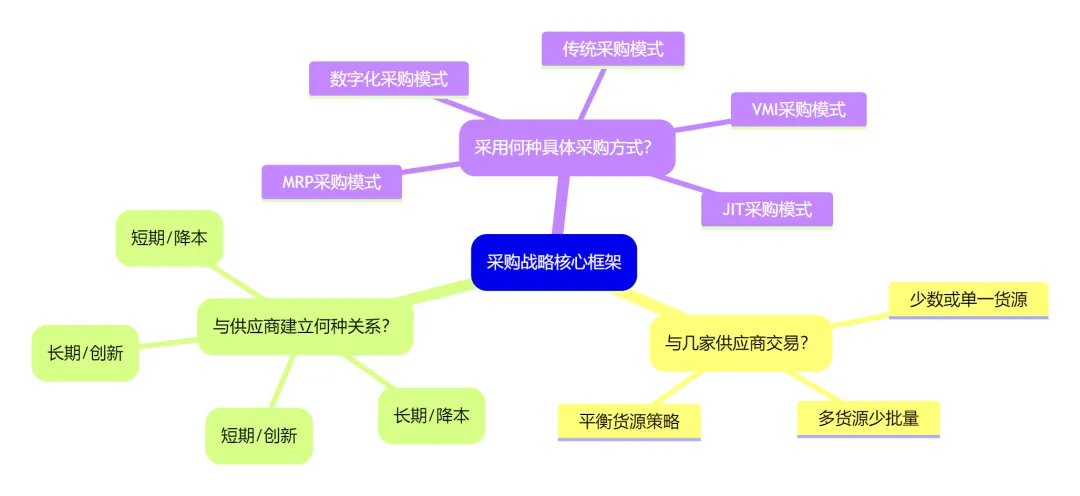 采购战略解决“向谁买、怎么买、如何管理”的问题,其决策核心围绕三大板块展开: