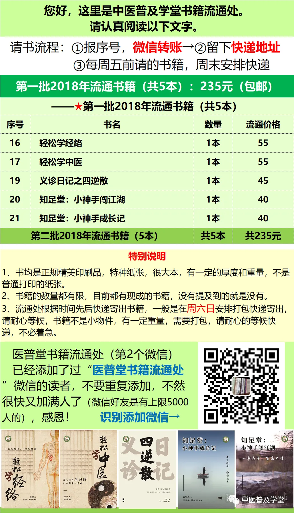 由于大家的热忱信任,原2019年的这篇《中医普及学堂2019年新春大礼—— 内部学习资料请书流通须知》文章中,医普堂书籍流通处的微信已经加满5000人。为此,我们重新创建了一个“书籍流通处”的微信号(附文末),以便需要请书的朋友们,特此重发文以说明,感恩。
