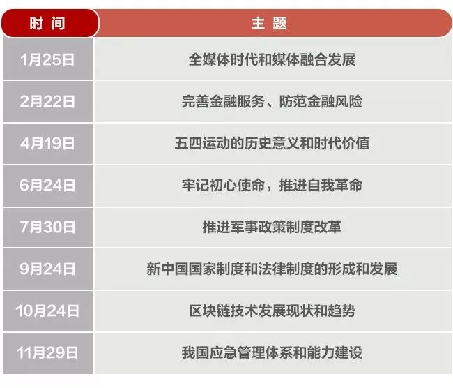学习形式:这次中央政治局集体学习把“课堂”设在了媒体融合发展的第一线,采取调研、讲解、讨论相结合的形式进行。学习笔记:党报、党刊、党台、党网等主流媒体必须紧跟时代,大胆运用新技术、新机制、新模式,加快融合发展步伐,实现宣传效果的最大化和最优化。党报党刊要加强传播手段建设和创新,发展网站、微博、微信、电子阅报栏、手机报、网络电视等各类新媒体,积极发展各种互动式、服务式、体验式新闻信息服务,实现新闻传播的全方位覆盖、全天候延伸、多领域拓展,推动党的声音直接进入各类用户终端,努力占领新的舆论场。要因势而谋、应势而动、顺势而为,加快推动媒体融合发展,使主流媒体具有强大传播力、引导力、影响力、公信力,形成网上网下同心圆,使全体人民在理想信念、价值理念、道德观念上紧紧团结在一起,让正能量更强劲、主旋律更高昂。【详细】学习形式:丝路基金有限责任公司党委书记、董事长谢多同志就这个问题作了讲解,并谈了意见和建议。学习笔记:要深化对国际国内金融形势的认识,正确把握金融本质,深化金融供给侧结构性改革,平衡好稳增长和防风险的关系,精准有效处置重点领域风险,深化金融改革开放,增强金融服务实体经济能力,坚决打好防范化解包括金融风险在内的重大风险攻坚战,推动我国金融业健康发展。金融要为实体经济服务,满足经济社会发展和人民群众需要。金融活,经济活;金融稳,经济稳。经济兴,金融兴;经济强,金融强。经济是肌体,金融是血脉,两者共生共荣。我们要深化对金融本质和规律的认识,立足中国实际,走出中国特色金融发展之路。【详细】学习形式:中央团校特聘教授、中国青少年研究中心研究员李玉琦同志就这个问题作了讲解,并谈了意见和建议。学习笔记:五四运动是我国近现代史上具有里程碑意义的重大事件,五四精神是五四运动创造的宝贵精神财富。我们纪念五四运动、发扬五四精神,必须加强对五四运动和五四精神的研究,以引导广大青年在五四精神激励下,为决胜全面建成小康社会、夺取新时代中国特色社会主义伟大胜利、实现中华民族伟大复兴的中国梦不懈奋斗。要加强对五四运动历史意义的研究,深刻揭示五四运动对当代中国发展进步的深远影响。要加强对五四精神时代价值的研究,深入揭示新时代发扬五四精神的意义和要求。要加强对五四运动以来中国青年运动的研究,深刻把握当代中国青年运动的发展规律。要加强对五四运动史料和文物收集、整理、保护,为后人继承和发扬五四精神留下历史记忆。【详细】学习形式:中央党史和文献研究院研究员孙业礼同志就这个问题作了讲解,并谈了意见和建议。学习笔记:我们党要求全党同志不忘初心、牢记使命,就是要提醒全党同志,党的初心和使命是党的性质宗旨、理想信念、奋斗目标的集中体现,越是长期执政,越不能忘记党的初心使命,越不能丧失自我革命精神,在新时代把党的自我革命推向深入,把党建设成为始终走在时代前列、人民衷心拥护、勇于自我革命、经得起各种风浪考验、朝气蓬勃的马克思主义执政党。牢记初心和使命,推进党的自我革命,要坚持加强党的集中统一领导和解决党内问题相统一,要坚持守正和创新相统一,要坚持严管和厚爱相统一,要坚持组织推动和个人主动相统一。【详细】学习形式:军事科学院研究员谭亚东同志就军事政策制度改革作了讲解,并谈了意见和建议。学习笔记:军事政策制度是我们党治国理政的重要保障,军事政策制度改革是对我军的一次制度性重构,关系实现党在新时代的强军目标、把人民军队全面建成世界一流军队,关系实现“两个一百年”奋斗目标、实现中华民族伟大复兴的中国梦。要强化使命担当,强化系统集成,强化创新突破,强化军地合力,进一步统一思想和行动,凝心聚力实施改革强军战略,把新时代强军事业不断推向前进。【详细】学习形式:全国人大常委会委员、宪法和法律委员会委员于志刚同志就这个问题进行了讲解,提出了意见和建议。学习笔记:新中国成立70年来,我们党领导人民不断探索实践,逐步形成了中国特色社会主义国家制度和法律制度,为当代中国发展进步提供了根本保障,也为新时代推进国家制度和法律制度建设提供了重要经验。中国特色社会主义国家制度和法律制度是一套行得通、真管用、有效率的制度体系,这是我们坚定“四个自信”的一个基本依据。中国特色社会主义国家制度和法律制度需要坚持好、实施好,也需要不断完善和发展。制度的生命力在于执行。要强化制度执行力,加强制度执行的监督,切实把我国制度优势转化为治理效能。【详细】学习形式:浙江大学教授、中国工程院院士陈纯就这个问题作了讲解,并谈了意见和建议。学习笔记:要强化基础研究,提升原始创新能力,努力让我国在区块链这个新兴领域走在理论最前沿、占据创新制高点、取得产业新优势。要抓住区块链技术融合、功能拓展、产业细分的契机,发挥区块链在促进数据共享、优化业务流程、降低运营成本、提升协同效率、建设可信体系等方面的作用。【详细】学习形式:清华大学教授薛澜就这个问题作了讲解,并谈了意见和建议。学习笔记:应急管理是国家治理体系和治理能力的重要组成部分,承担防范化解重大安全风险、及时应对处置