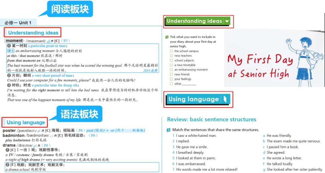 新教材采用板块式编写,每一个板块是一个独立的教学活动。但是教材词汇表没有按板块将词汇进行划分。《新高中英语词汇学习笔记》依据老师的上课习惯,将每单元词汇按照新教材板块编排,便于使用时迅速定位和查找。