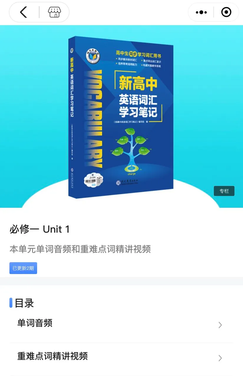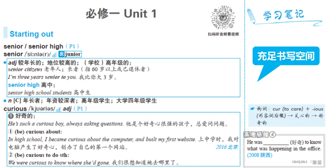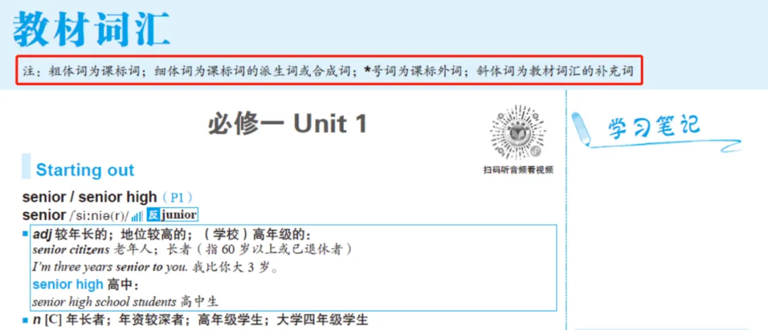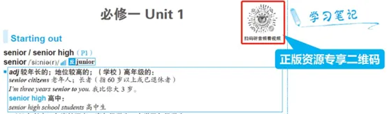 《新高中英语词汇学习笔记》每单元首页附有正版资源专享二维码,扫码即可进入正版资源小程序,“听”本单元单词音频(含中文释义),“看”本单元重难点词讲解视频。随时随地,想学就学。