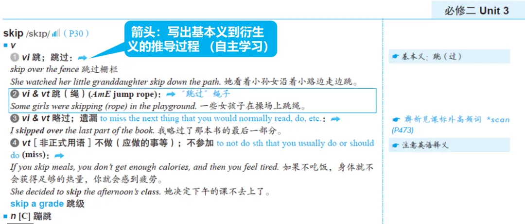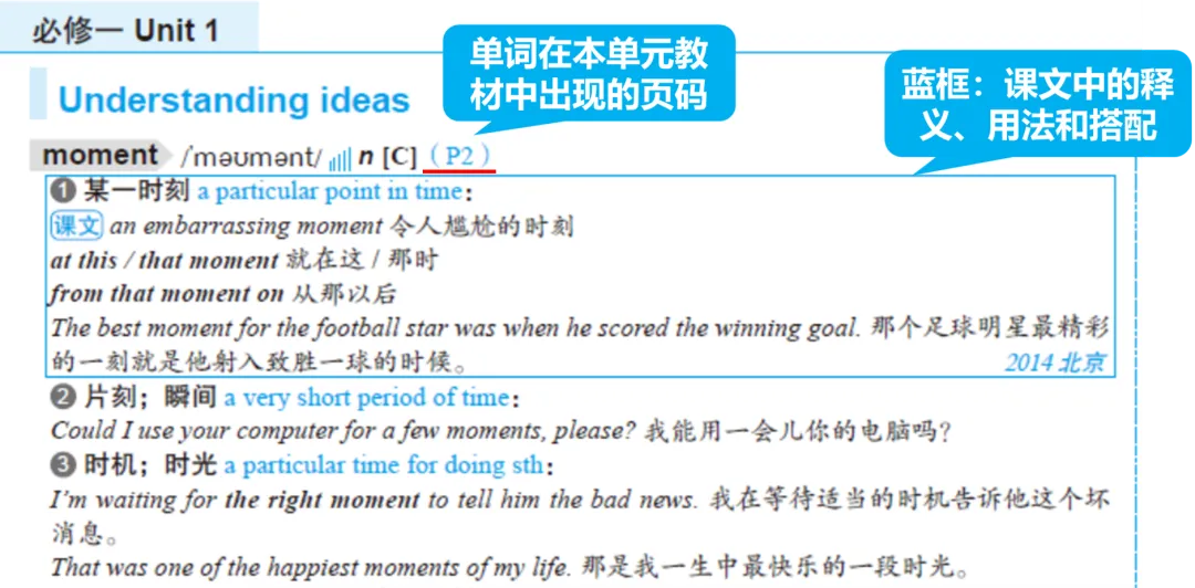 为了方便老师备课和学生自学,我们标注了单词在本单元教材中出现的页码;针对多义词,又用蓝框突显该词汇在教材中的释义、用法和搭配。