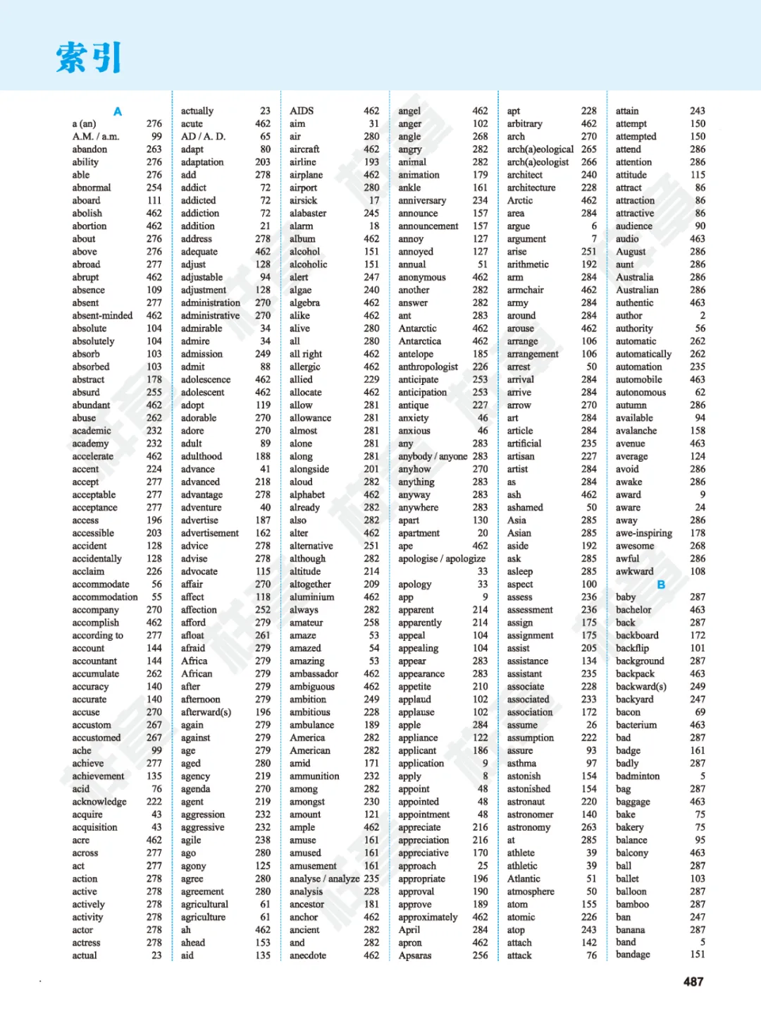 本书设有“索引”部分,将全书收录的词条按照字母顺序排序,方便学生查找单词。