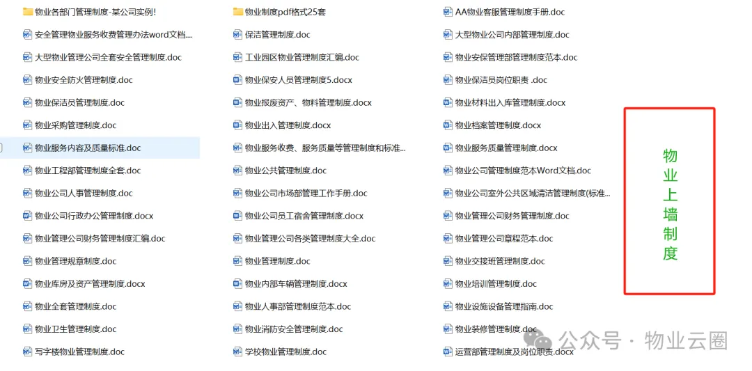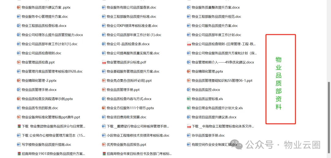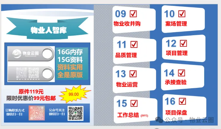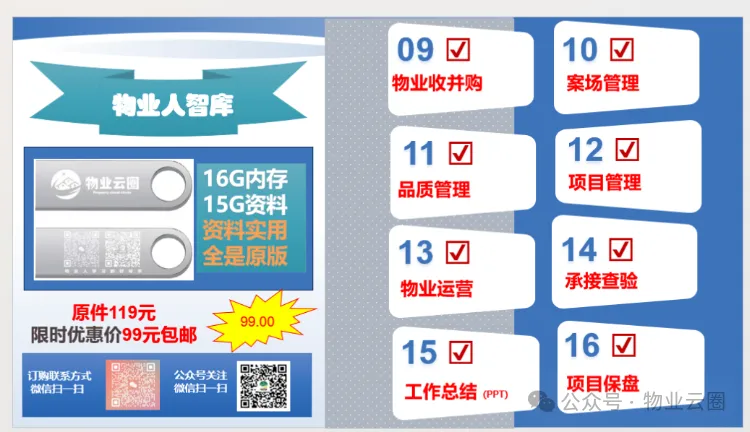 物业云圈物业学习智库物业资料U盘,15G海量物业全套运营文件资料,全面实用的专业资料汇编,涵盖物业全生命周期的各个方面,收录了物业公司组建与管理、物业收并购、物业前期筹备、招标投标、方案策划、前期介入、案场服务、接管验收、顾问咨询、入伙装修、客户服务、设备管理、秩序维护、保洁绿化、人事行政、品质管理、财务管理、团队管理、ISO质量体系、制度规程、表单合同、培训视频等。