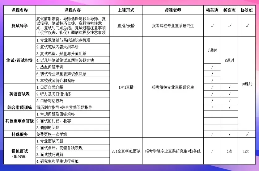 课程分为复试协议班、复试辅导班(与复试协议班包含内容一致)、复试精英班、复试拔高班,均为一对一授课。