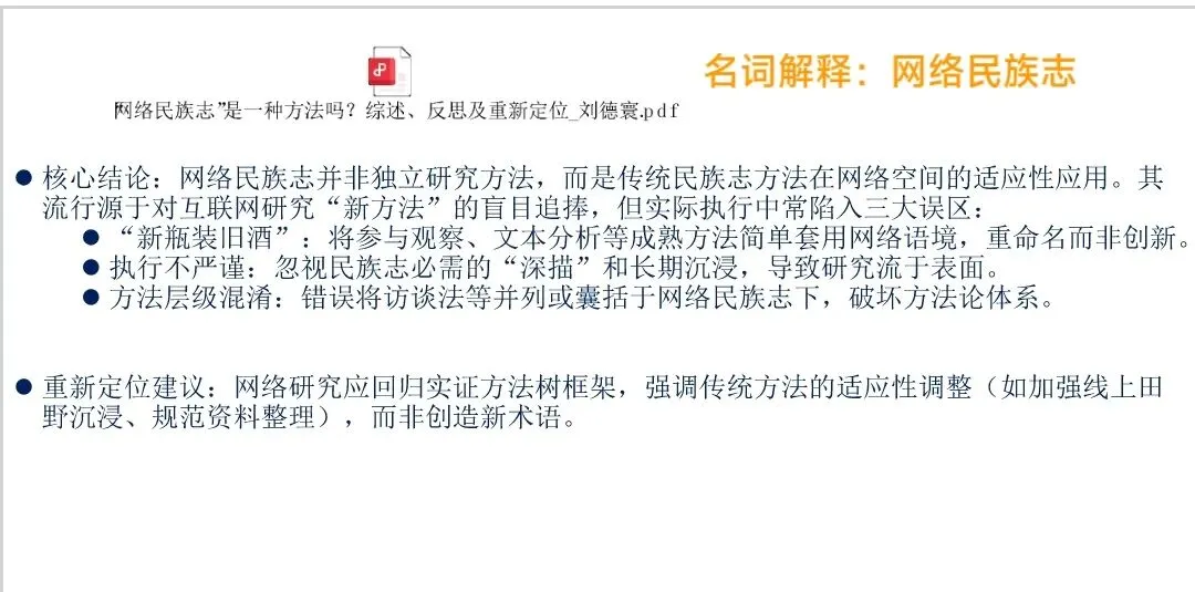 题目解析:由罗伯特·科兹涅茨提出,是传统人类学民族志方法在互联网时代的适应性变体。它是一种定性研究方法,旨在通过深入观察、参与和分析网络社区中的文本、互动和符号,来理解网络文化、社群规范及成员认同。与传统民族志相比,它具有非在场性、文本导向性)和高效性等特点,但也面临网络身份真实性和研究伦理的挑战。