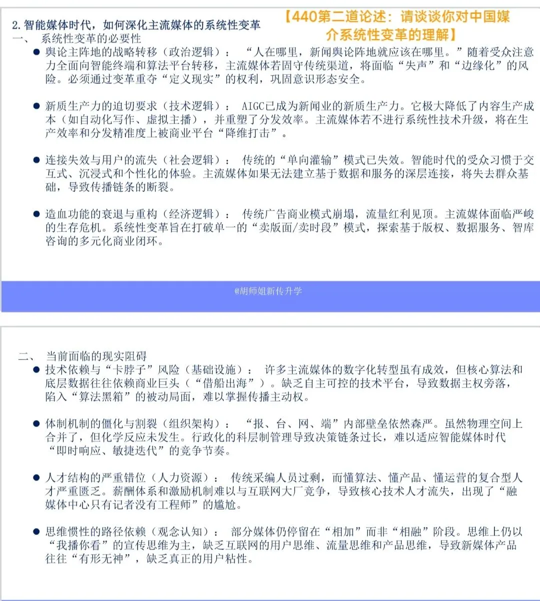 答题关键:这道题目考察的是考生对中国新闻传播业当下宏观图景的整体把握。关键词“系统性”意味着不能只谈“技术”或只谈“内容”,而必须从顶层设计、组织架构、生产流程、经营模式以及社会治理等多个维度构建一个全方位的变革图景。