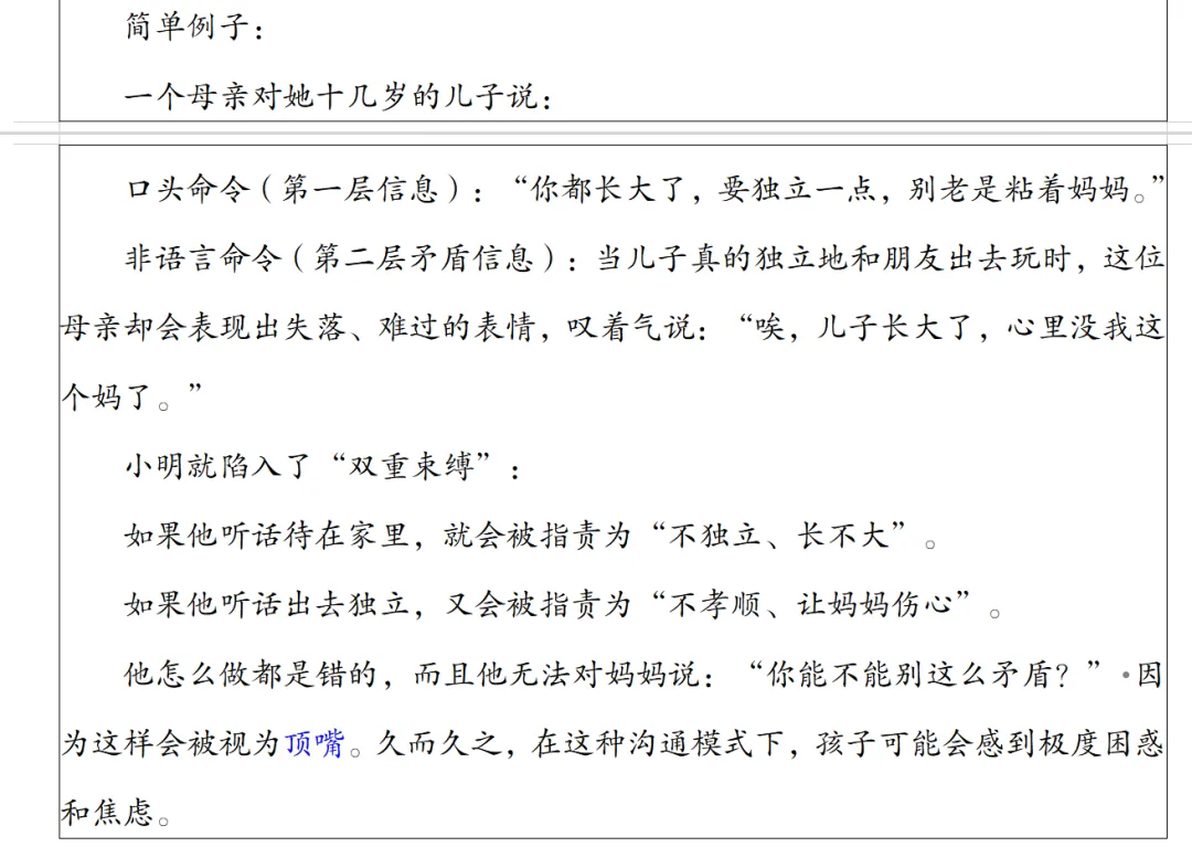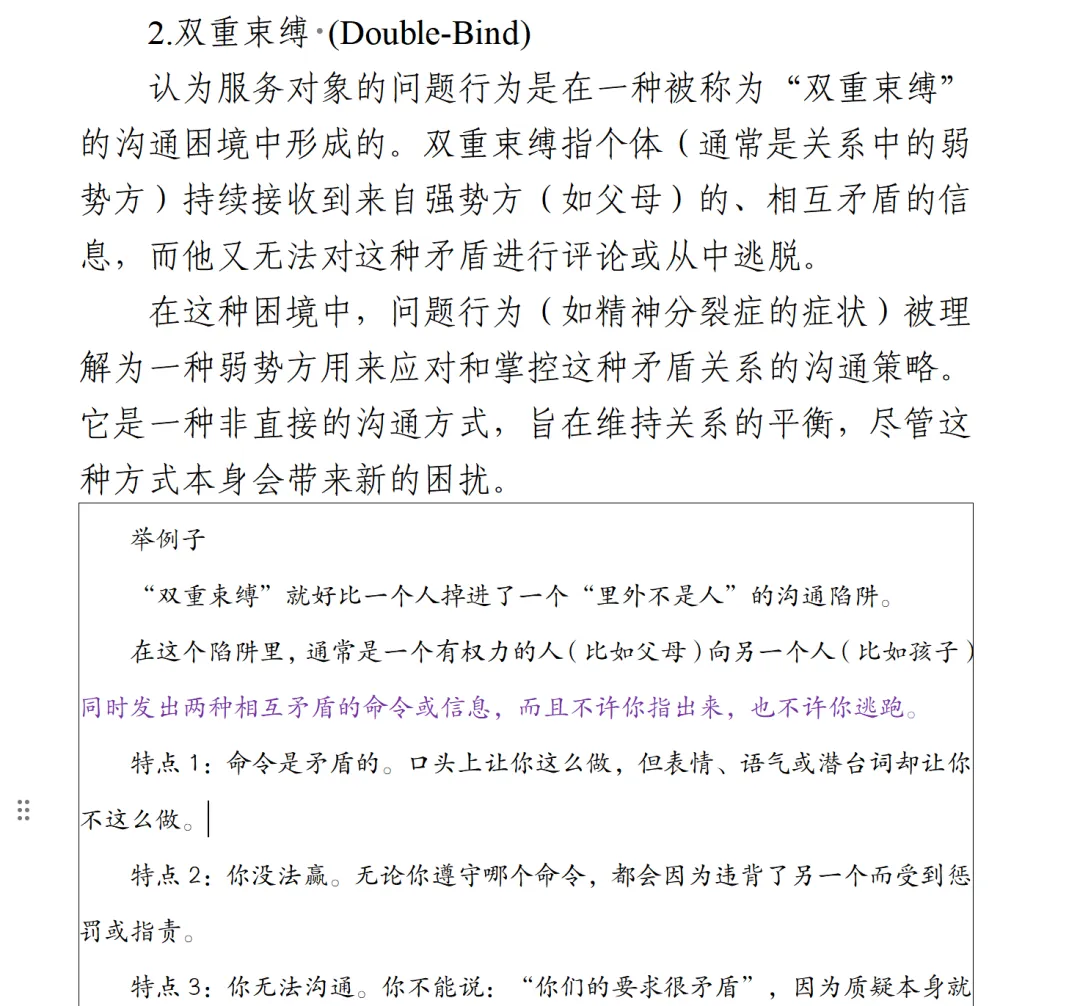 其实可以约等于文化敏感性,这个我讲过,算是社会工作者的基本能力之一,最早是在西方,社会工作界,提倡社会工作者要关注不同族裔的习惯,风俗,文化背景等等,即“对文化的东西敏感”,对“文化感知与应用的能力”但是在我国有这类相关的应用吗,肯定是有的,比如民族大学24还是25年就考过一个题目,叫作“民族社会工作”,这说明命题的一个大的导向,除此之外,对于不同出身、不同阶层,农村城市群体,是不是也有很多要注意的?我国社会工作部成立之后,慢慢在更多的重视这种分类,扩散,本质是一种好的倾向。社会治理就是复杂的,就是要针对性施策的。5.双重束缚