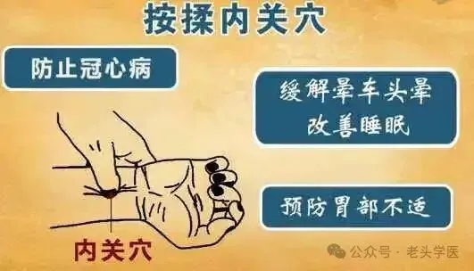 内关是急救要穴之一。对心阳虚衰、休克、低血压、中暑、晕厥等症皆有急救的作用,常和人中、涌泉合用。