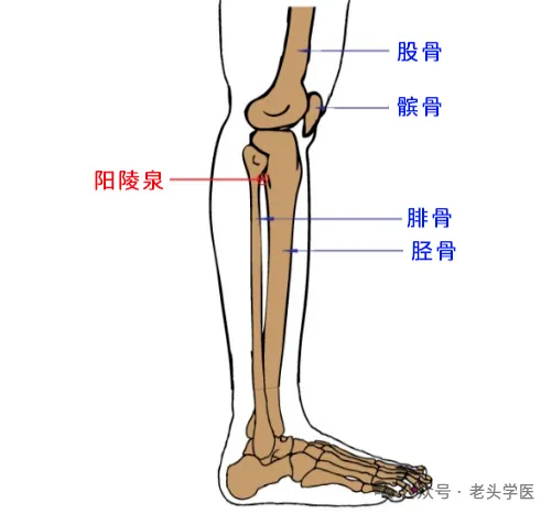 ②膝外侧两个凸起的骨头(胫骨头与腓骨头)连线画正三角形,三角形顶点处即是阳陵泉。
