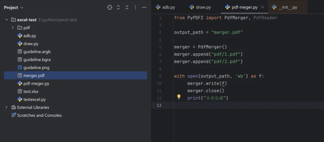 from PyPDF2 import PdfMerger, PdfReaderoutput_path = "merger.pdf"merger = PdfMerger()merger.append("pdf/1.pdf")merger.append("pdf/2.pdf")with open(output_path, 'wb') as f:merger.write(f)merger.close()print("合并完成")