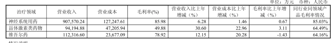 药品类的毛利率为70%左右。药品里面神经类药品的毛利率最高: