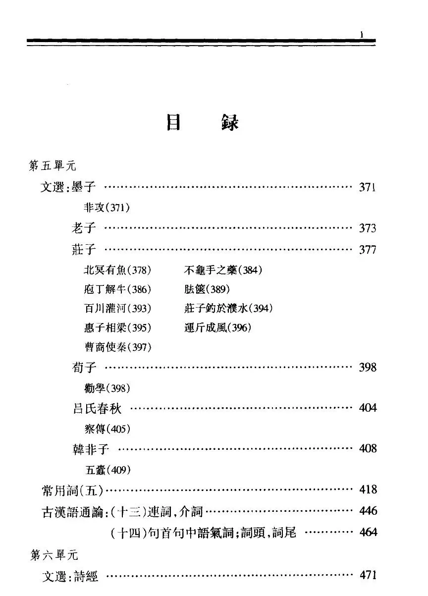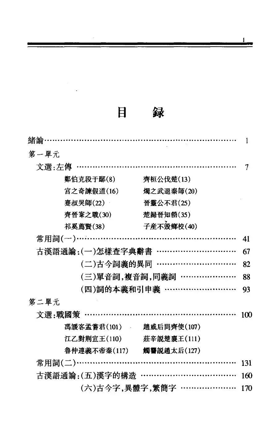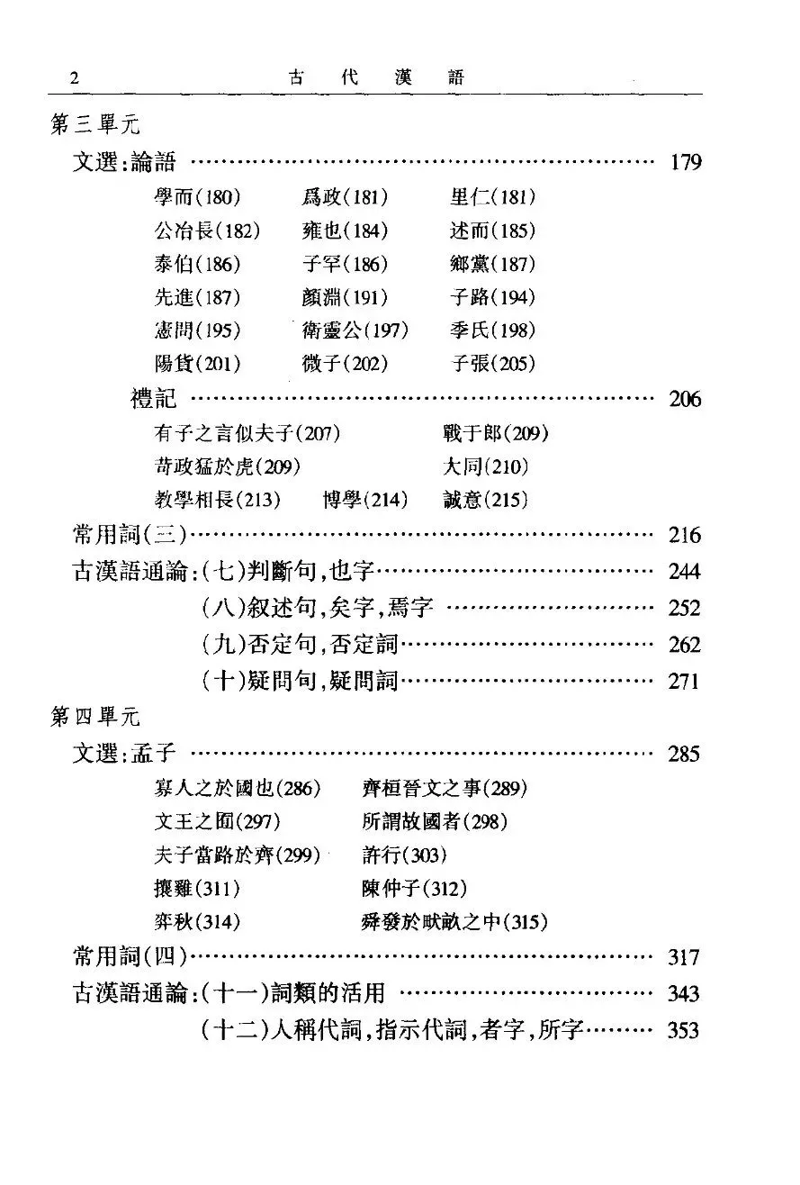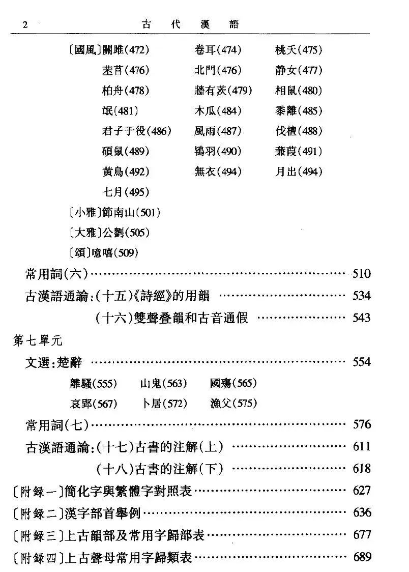 通过目录可以看到这本教材涵盖古代汉语的各个方面,包括绪论、文选、常用词、用韵、词义等方面。在通论的知识总结中,汉字、语法都占了大幅篇幅,也是《古代汉语》这门课程的核心章节。