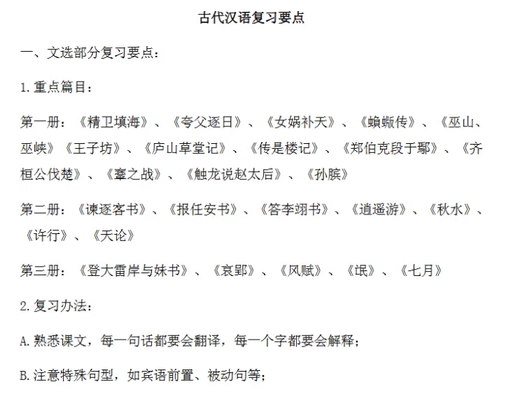 对于文选部分,需要注意特殊句型、关键词语、和字词的特殊用法。特殊句型,如宾语前置、被动句登;字词特殊用法,如名词作动词,名词作状语,使动用法,意动用法等;关键词语,如注意关键词语的古义、本义、特殊意义,尤其是不同于现代汉语的意义。此外,还需要注意,复习范围涉及古今词义不同辨析例、词的本义探求例、引申义分析例、同义词辨析。