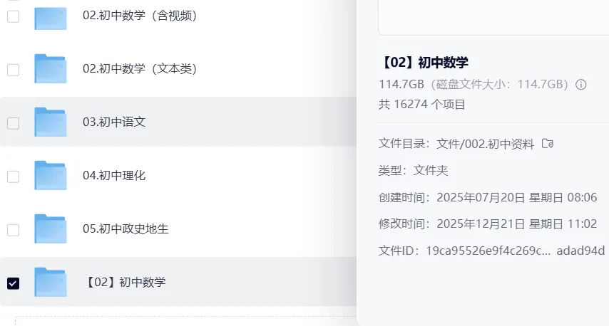 随着悠宝进入高年级,资料整理的速度明显有点跟不上悠宝学习的速度了。首先是文言文方面已经有很多典故她能娓娓道来,我已经成了好奇的听众;其次是悠宝对视频资料的要求也是越来越高,可以说“所听皆为精品中的精品”,上次找了几个资料给她,都因不符合要求被批“敷衍”。今天看了网盘里面的资料,发现真多,存了16.5T。像一个蚂蚁,不停地搬运,存储,筛选……初中数学资料按照 有视频和纯文本资料分为2个目录存储02.初中数学(含视频)
