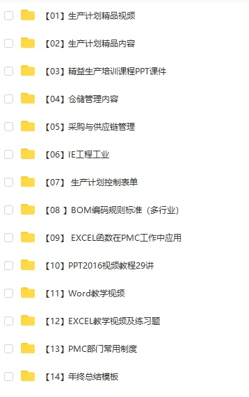 下面本是本人多年来收集整理的有关于PMC、仓储、供应链、精益等所有资料打包出售,已经在群里的人员或者已经购买过的直接群里查找就有了,其他有需要的可请加好友备注:购买PMC资料;。整份有偿出售50元。上百份资料+高清视频。内容分为以下14个板块: