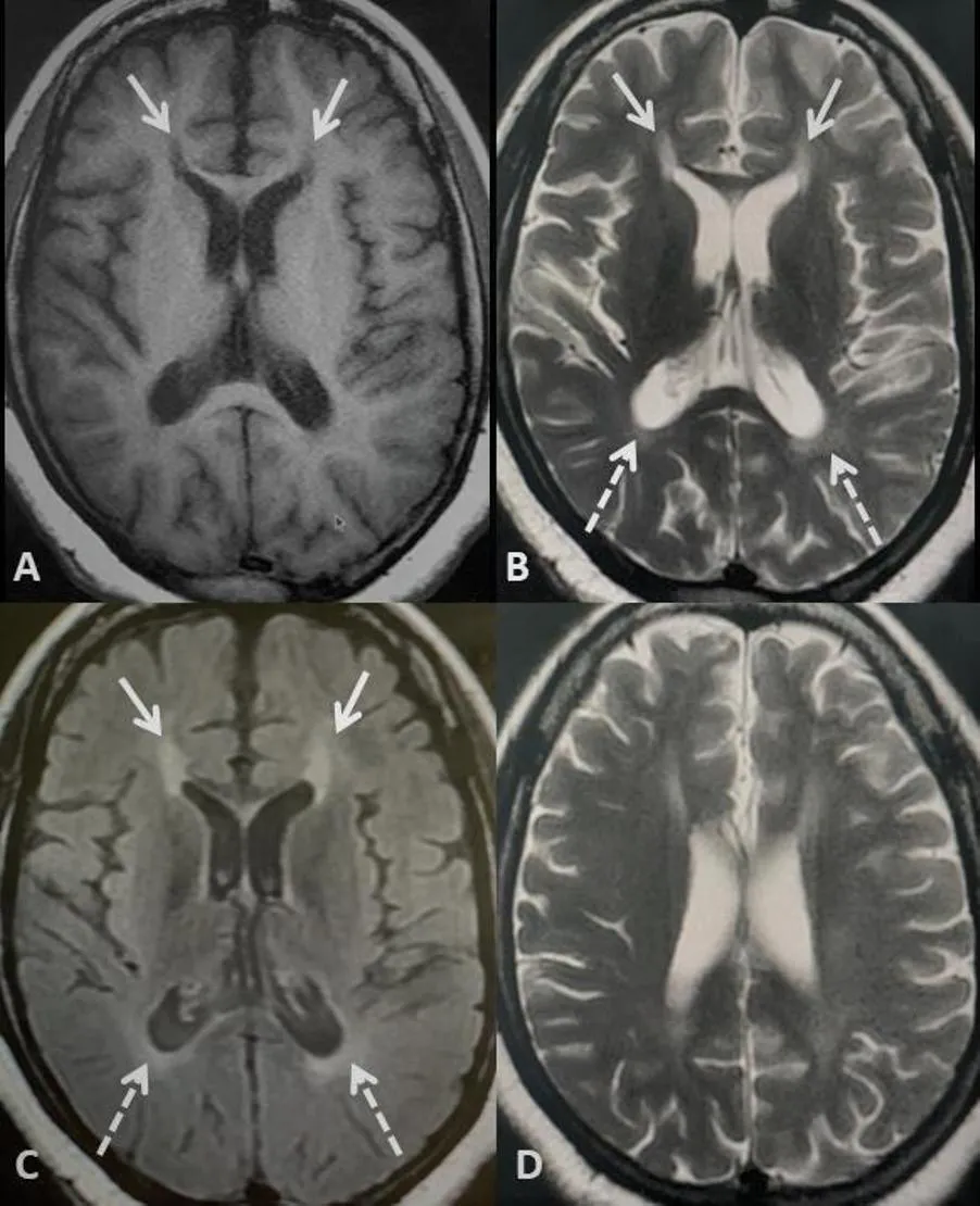 图1 轴位T1加权像(A)、轴位T2加权像(B)及轴位T2-FLAIR加权像(C)显示胼胝体膝部小钳区(箭头所示)存在特征性信号异常。该信号异常在T1加权像上呈低信号,在T2/FLAIR加权像(液体衰减反转恢复序列)上呈高信号,呈现典型的‘火焰’样形态,与猞猁耳特征极为相似。此外,还可见脑室周围白质高信号,尤其在枕角区域(虚线箭头所示)。另,头侧轴位T2加权像(D)显示轻度全脑萎缩,表现为脑沟间隙及脑室体积相对于年龄而言增大。