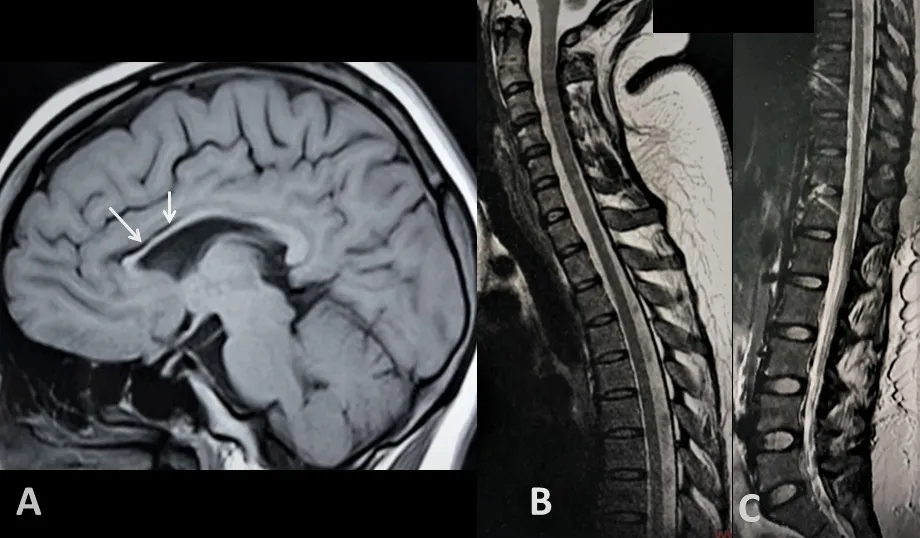 图2 脑胼胝体矢状T1加权像(A)显示整个胼胝体弥漫性变薄,且以胼胝体前部(箭头所示)为著。整个脊柱矢状T2加权序列(B、C)未见脊髓显著异常,亦无提示脊髓变薄或脊髓高信号的特征,该结果经轴位T2加权序列证实。