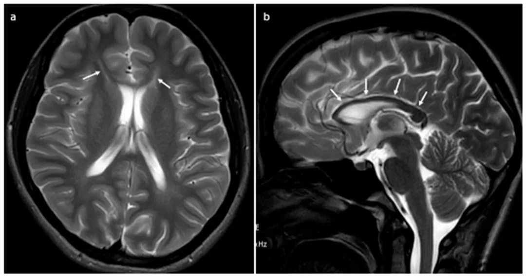 磁共振T2加权成像在轴位(a)和矢状位(b)平面显示:轴位图像可见侧脑室额角尖端T2信号增强,呈“猞猁耳”征(箭头所示);矢状位图像则清晰显示胼胝体萎缩(箭头所示)。