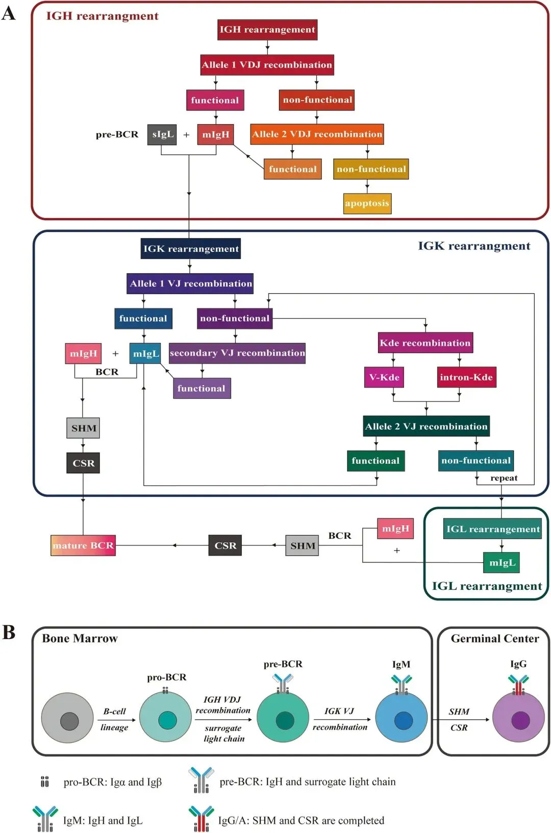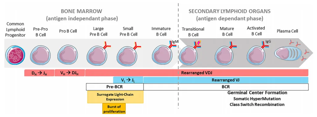 B细胞的发育经历几个阶段:干细胞-淋巴样祖细胞-祖B细胞(pro-B)-前B细胞(pre-B)-未成熟B细胞-成熟B细胞,在B细胞发育成熟的过程中发生V(D)J基因重排形成BCR。