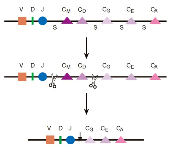 B细胞要进行类别转换就必须剪切掉IgM的恒定区,并与其他任何一种抗体的恒定区相连,比如BCR的恒定区由IgM转换为IgG的示例图如下: