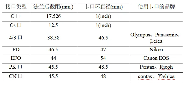 工业相机镜头接口常用的有C接口、CS接口、F接口、V接口、T2、Leica、M42接口(M42接口通常有T型:M42×0.75 以及SLR型:M42×1)、M72接口等。